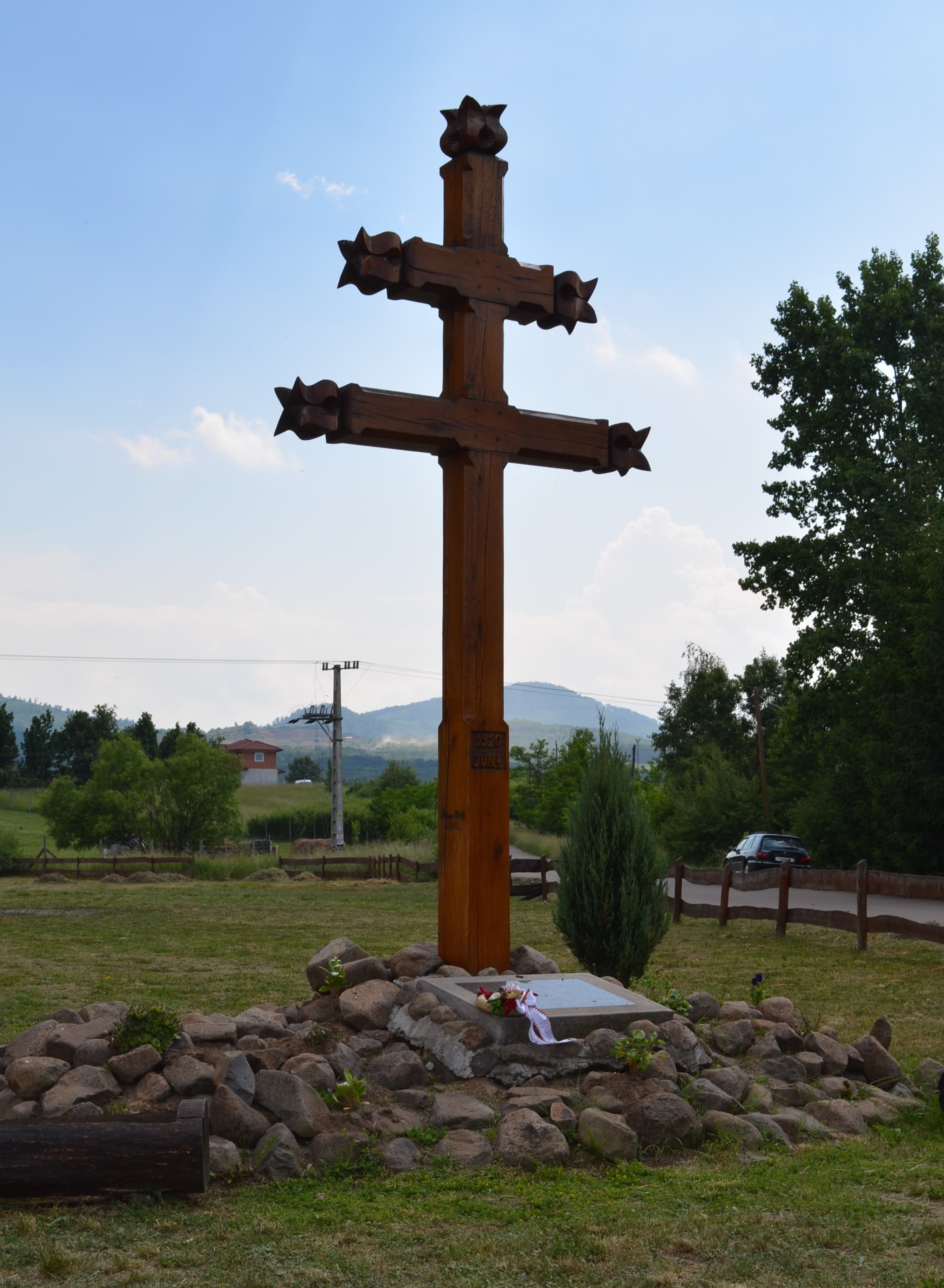 A kereszt előtte márványtáblán a történelmi Magyarország határvonala által körbeölelt szöveg: